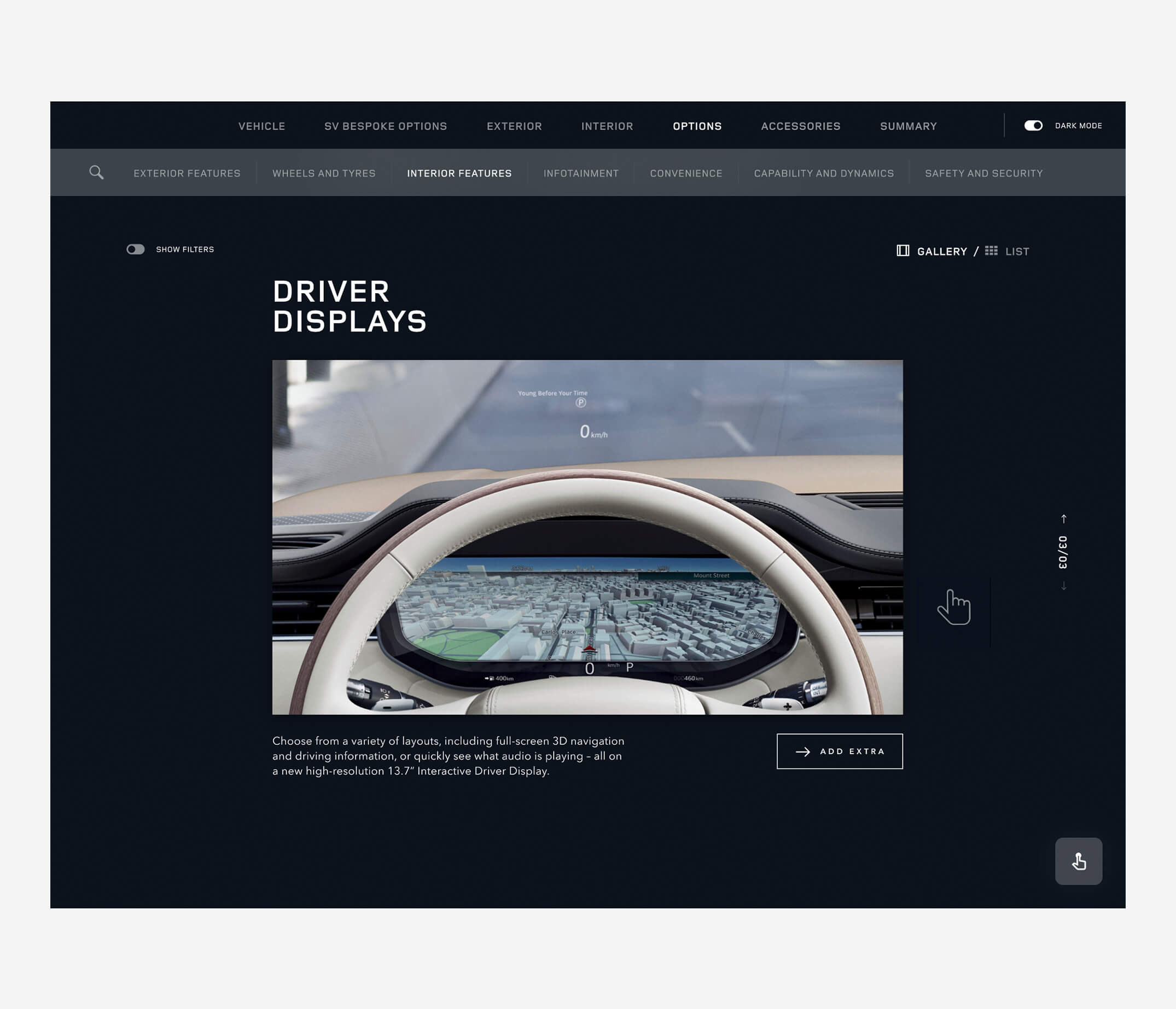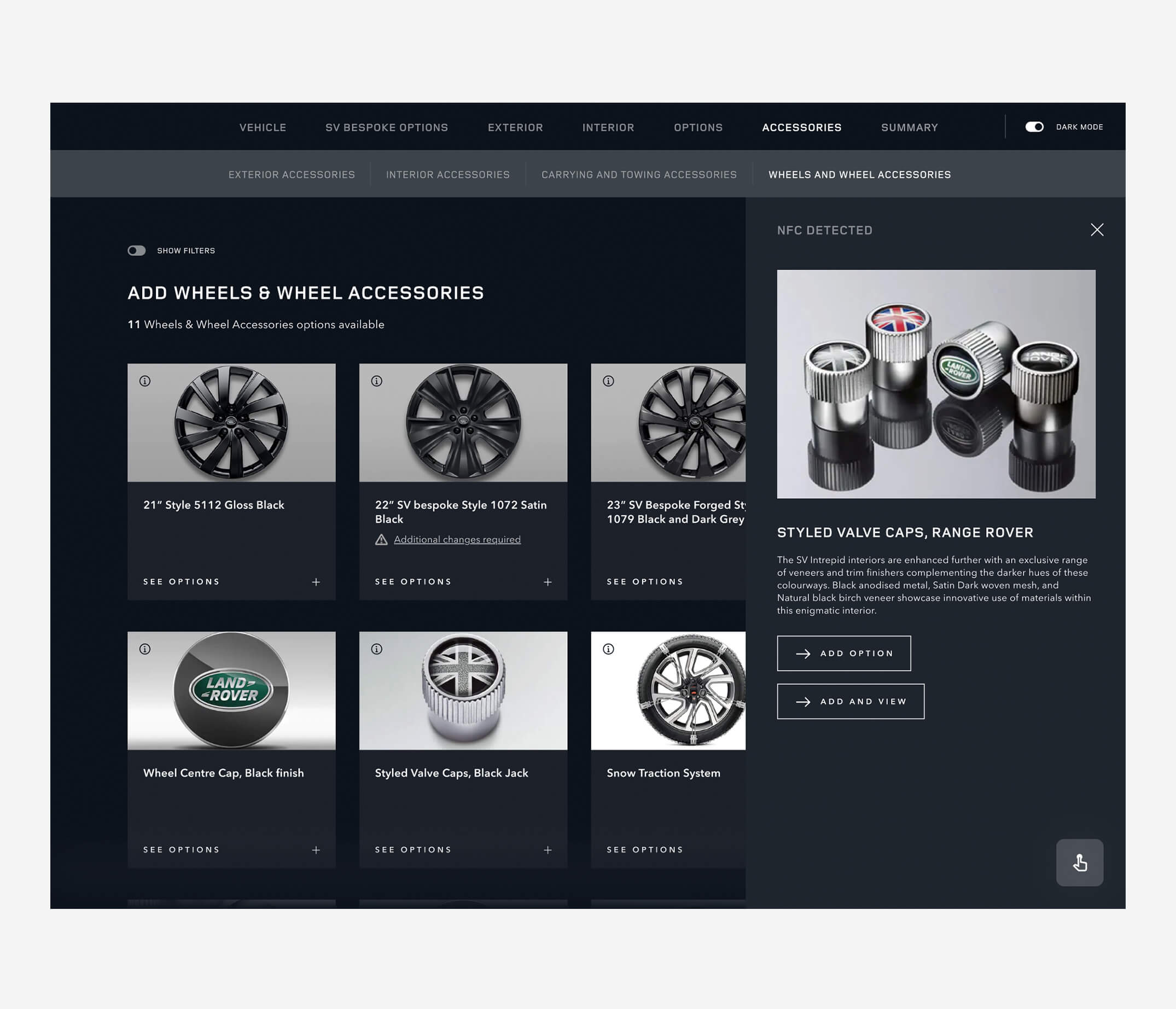 Working closely with ITG’s digital engineering team, we reimagined the configurator as a guided, tactile experience. Customers could explore new categories of options and rare materials, with a UX designed to encourage conversation rather than speed. A key innovation was the integration of NFC-enabled physical swatches: by placing a material sample on the suite’s table, the system instantly applied it to the digital vehicle build, blending hardware and software into a uniquely immersive interaction. The result was an experience that felt considered, luxurious, and worthy of the exclusivity of SVO – transforming configuration from a functional task into a moment of delight.