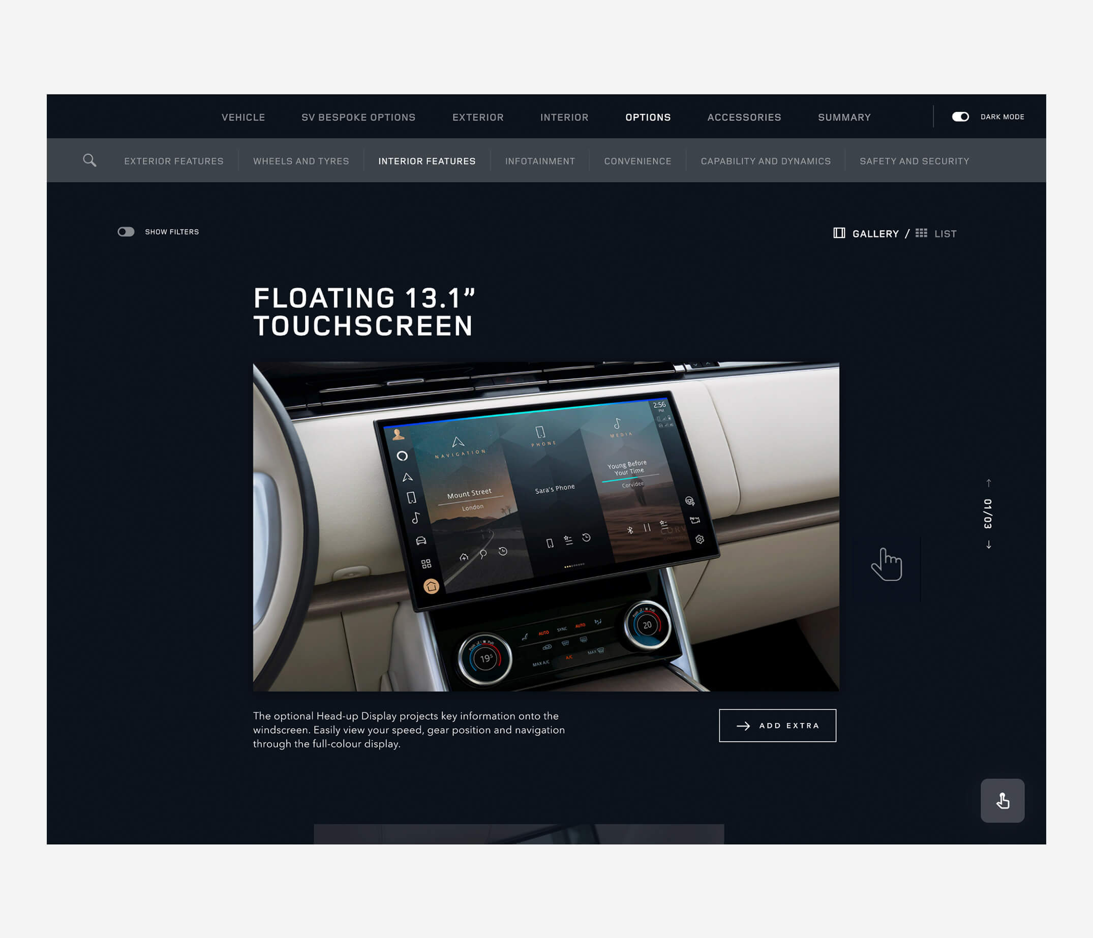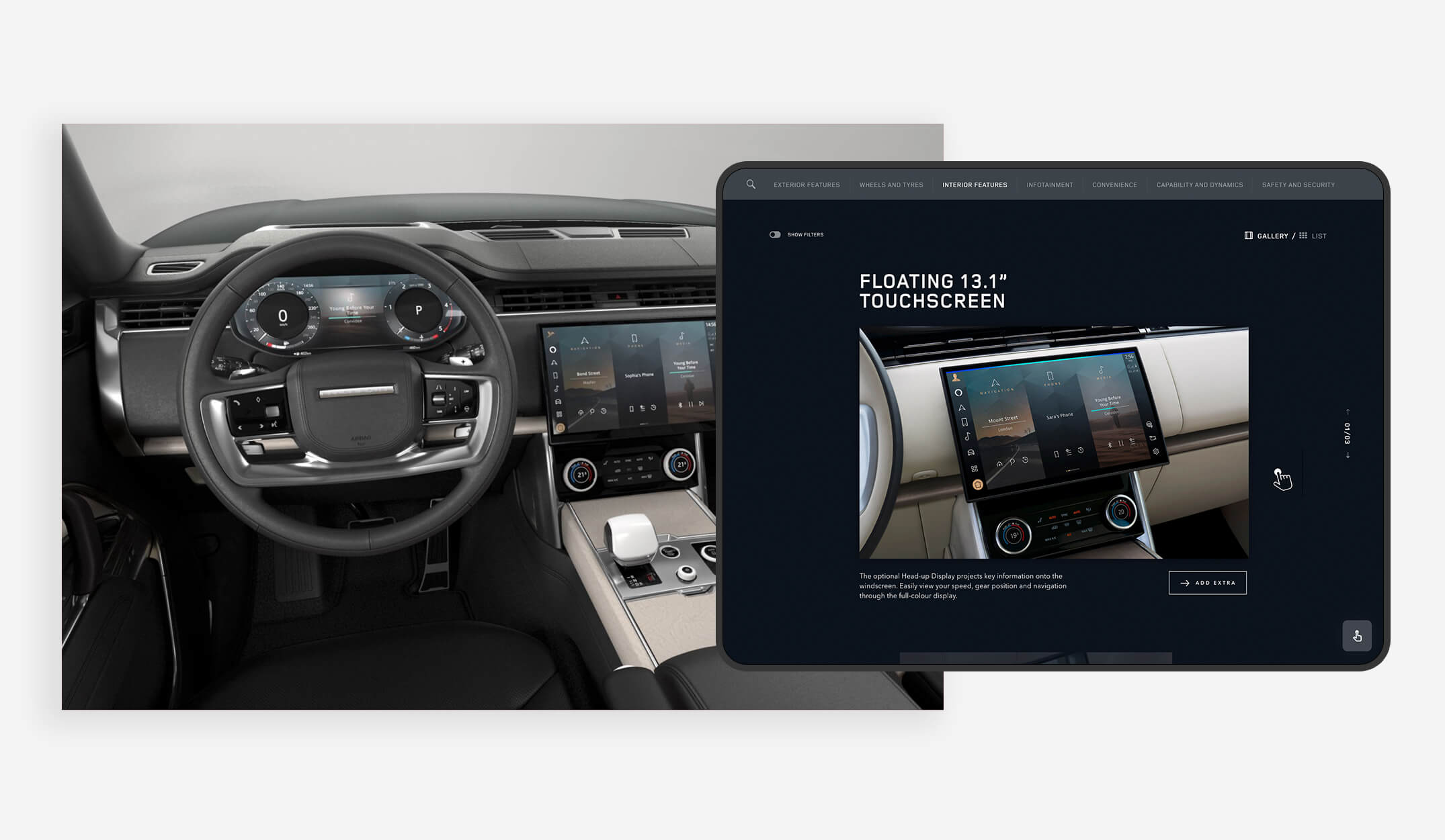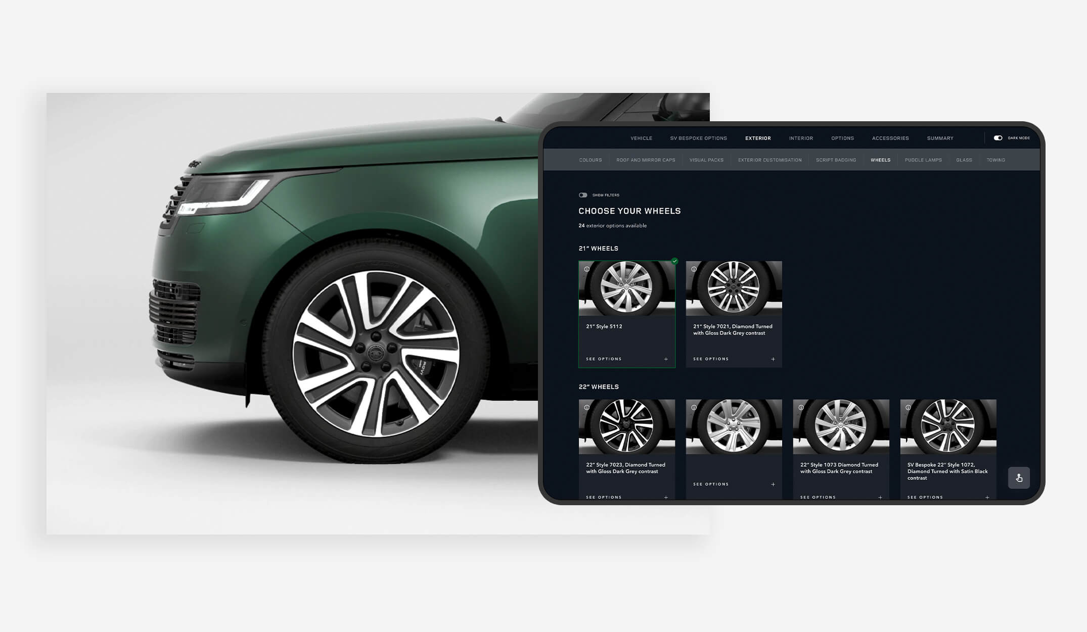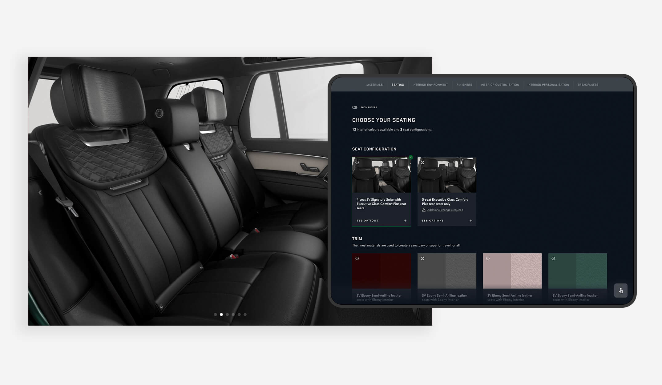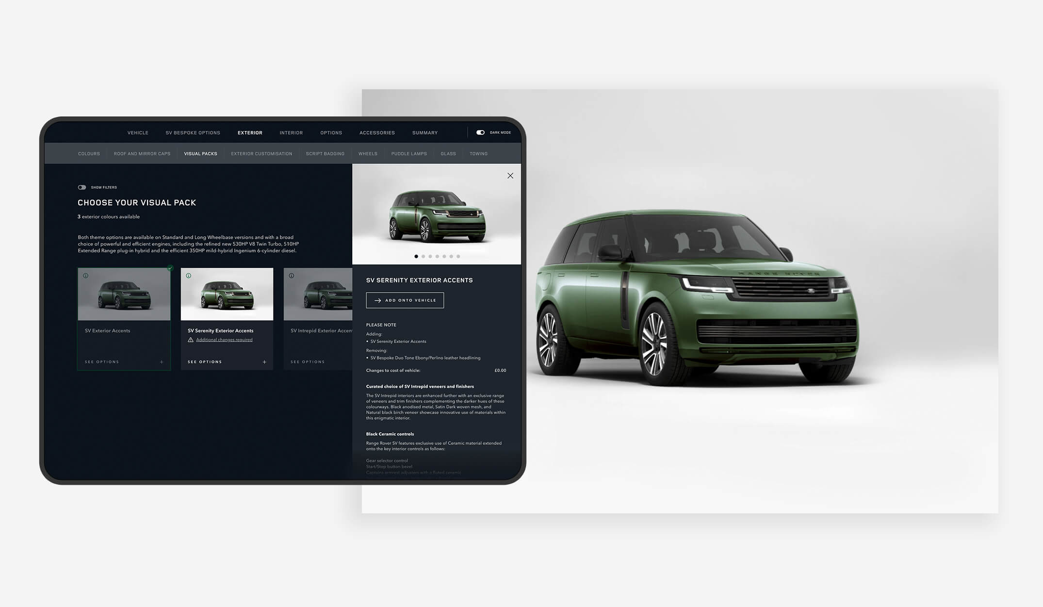 The existing JLR online configurator provided a solid foundation, but the SVO suite demanded something far more elevated. This was not about driving quick conversions — it was about delivering a memorable, concierge-led journey for clients commissioning highly bespoke vehicles. The challenge was twofold: adapting the online configurator to a dual-device showroom setup (an input tablet paired with a wall-mounted real-time display) while expanding it to accommodate an unprecedented range of paints, trims, accessories, and bespoke options unique to SVO vehicles.